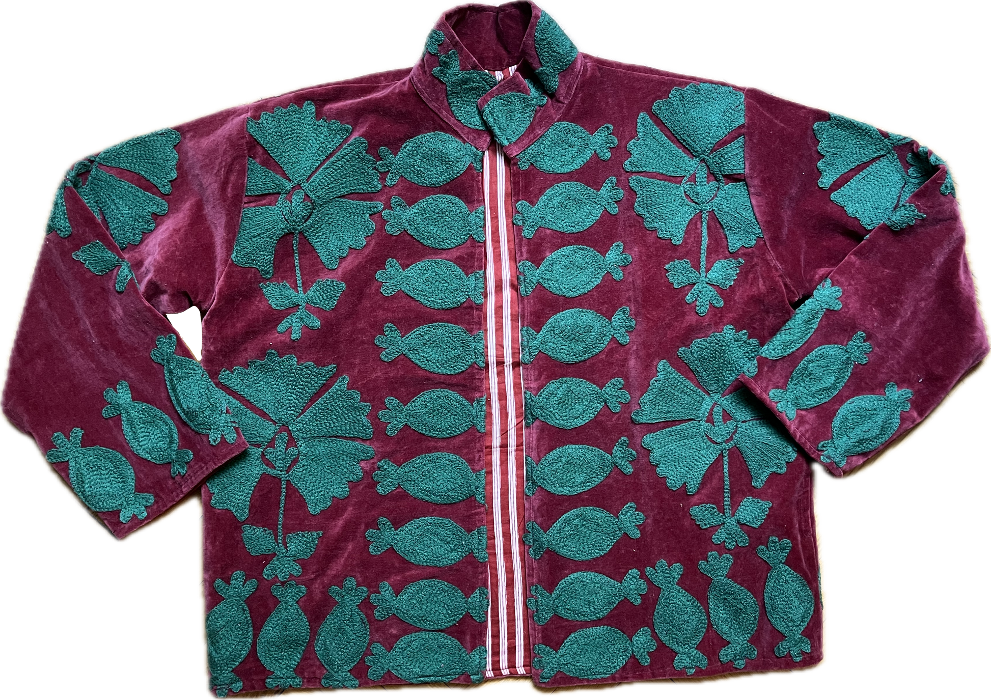 Totochic jackets combine a hand-dyed velvet exterior with colourful embroidery and a striped cotton lining inside. You can wear the jacket both sides! Totochic pieces also have a pocket on each side, left & right.