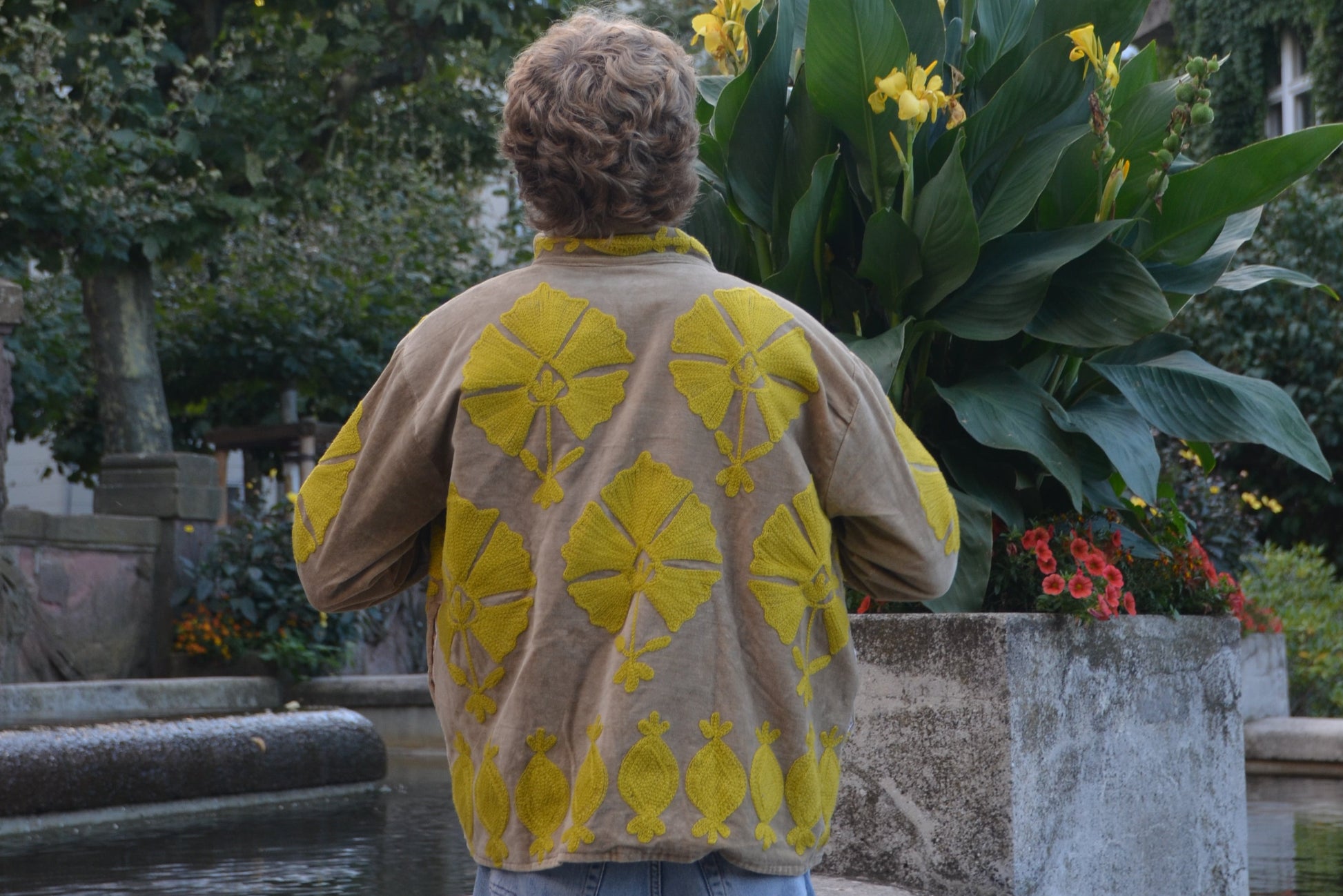 Totochic jackets combine a hand-dyed velvet exterior with colourful embroidery and a striped cotton lining inside. You can wear the jacket both sides! Totochic pieces also have a pocket on each side, left & right.