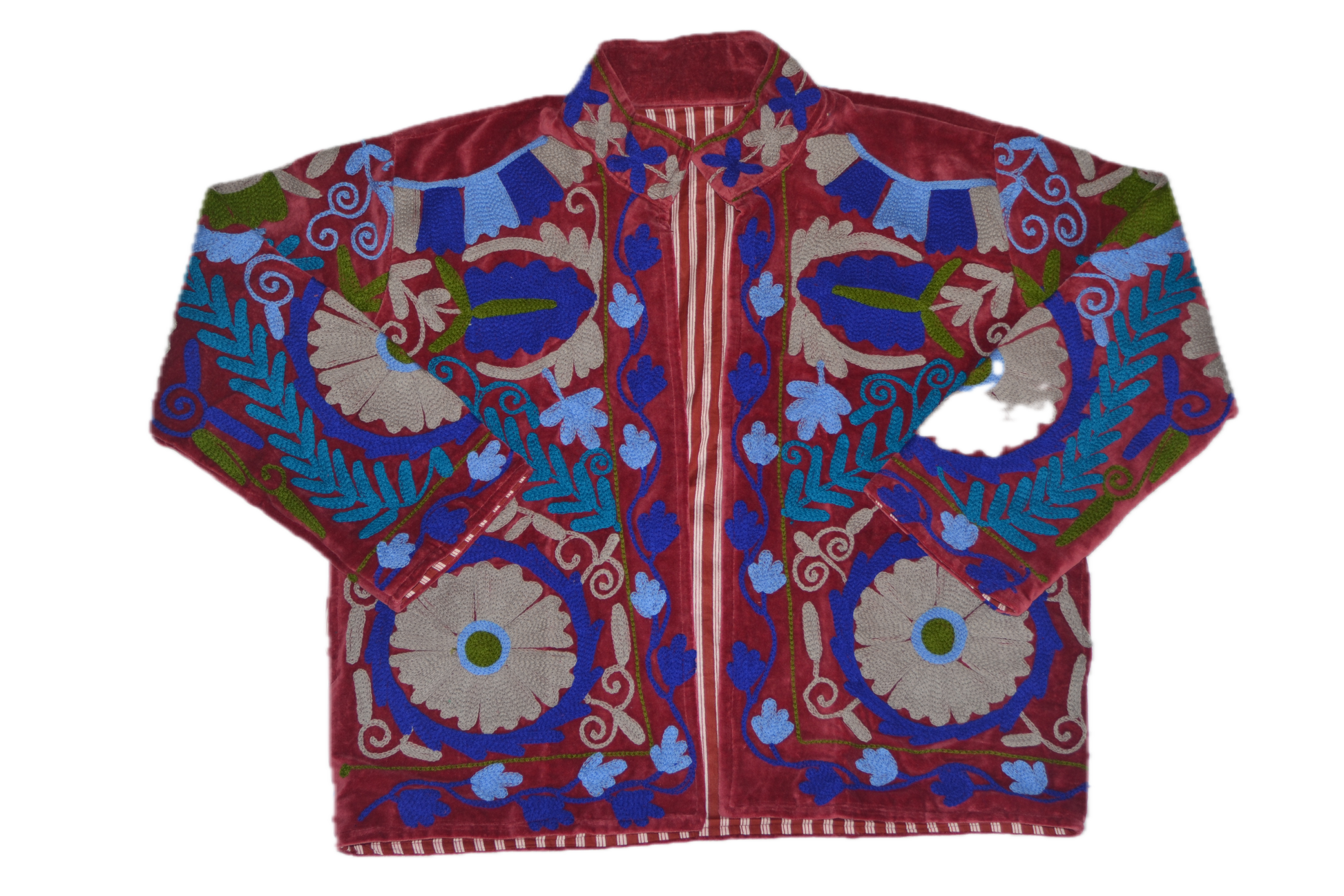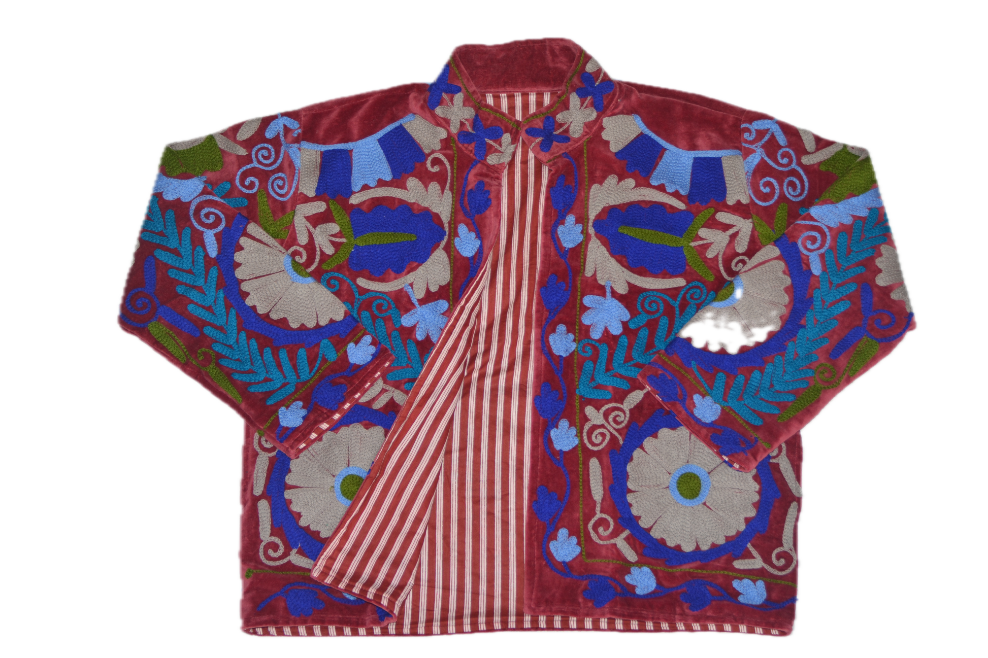 Totochic jackets combine a hand-dyed velvet exterior with colourful embroidery and a striped cotton lining inside. You can wear the jacket both sides! Totochic pieces also have a pocket on each side, left & right.
