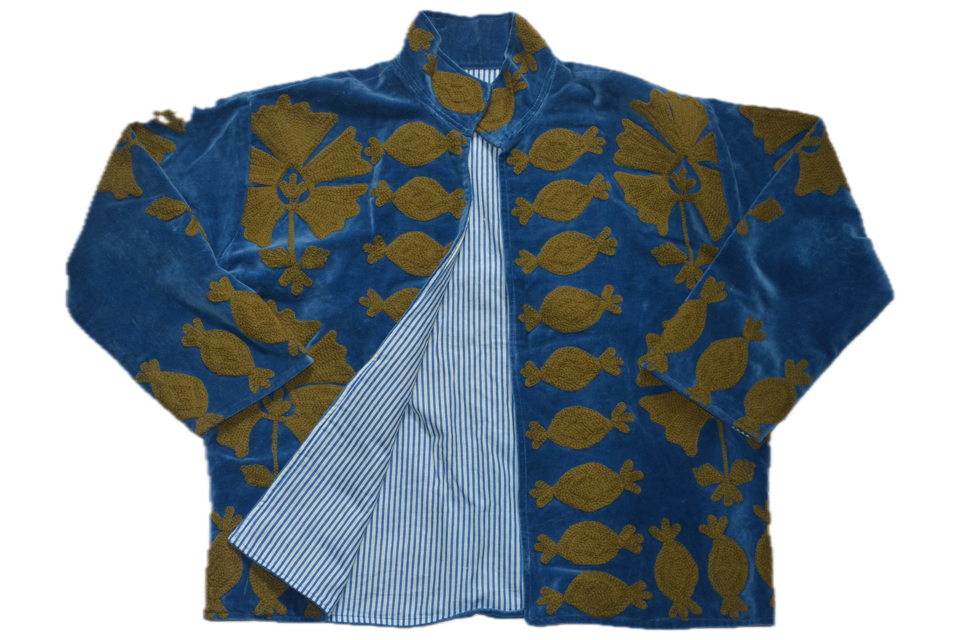 Totochic jackets combine a hand-dyed velvet exterior with colourful embroidery and a striped cotton lining inside. You can wear the jacket both sides! Totochic pieces also have a pocket on each side, left & right.