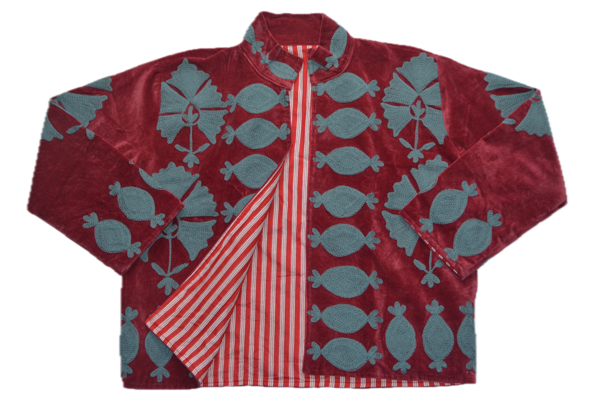 Totochic jackets combine a hand-dyed velvet exterior with colourful embroidery and a striped cotton lining inside. You can wear the jacket both sides! Totochic pieces also have a pocket on each side, left & right.
